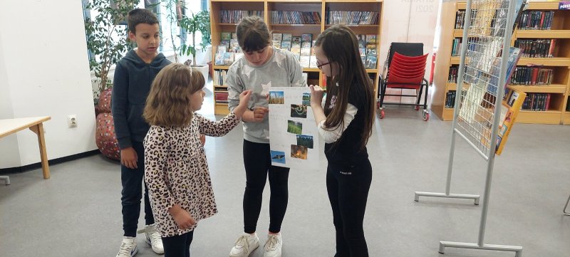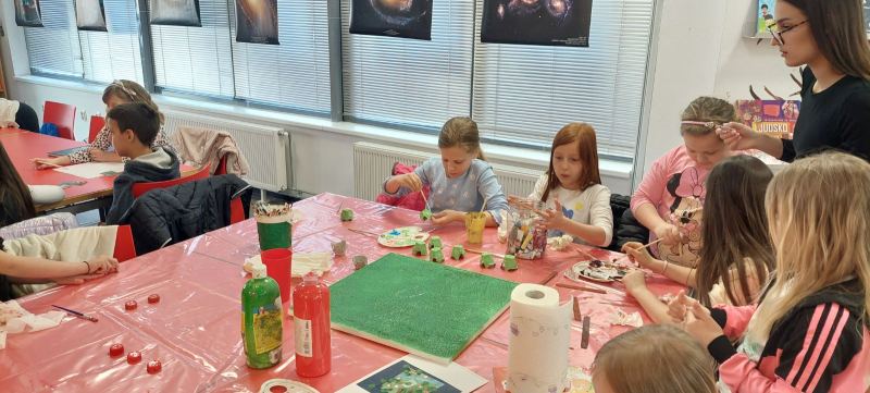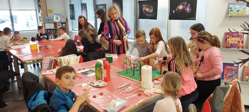 Obilježavanje Noći knjige na Odjelu za djecu i mlade počelo je prespavancem, a nastavljeno je u ponedjeljak dnevnim aktivnostima. Tako je u sklopu obilježavanja spomenute manifestacije, Dana planeta Zemlje i 150. godišnjice od rođenja Ivane Brlić-Mažuranić održana radionica naziva Priče iz davnine za zeleniji svijet danas. Uz malene korisnike knjižnice, na radionici su sudjelovali učenici 2. razreda Osnovne škole Vladimir Nazor Virovitica koji su došli u pratnji učiteljice Marine Predragović. Nakon uvodnog razgovora o važnosti knjige i čitanja, očuvanja planeta Zemlje i razgovora o životu i djelu Ivane Brlić-Mažuranić, uslijedio je praktični dio koji je bio vezan uz motive prirode i ekologije u Pričama iz davnina. Mališani su bili podijeljeni u dvije skupine. Jedna skupina tražila je motive prirode u pričama Sunce djever i Neva Nevičica te Šuma Striborova. Te iste motive potom su trebali prepoznati na prethodno pripremljenim sličicama od kojih su kreirali svoje vlastite slikopriče s temom očuvanja prirode i okoliša. Druga skupina reciklirala je materijale od plastike i kartona te kreirala vlastitu Šumu Striborovu, pa su tako za krošnje u šumi iskorištene stare kartonske kutije za jaja; od starih čepova su nastale šumske gljive, od stiropora podloga za šumu, itd. Na kraju smo svi skupa zaključili da su i čitanje i recikliranje jednako važni jer nas čine boljim ljudima.