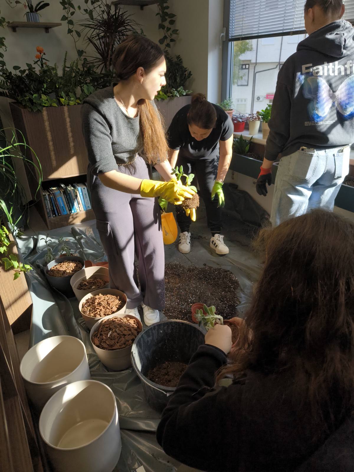 U srijedu 22. 10. 2025. započela je praktična suradnja s Industrijsko-obrtničkom školom Virovitica. Učenici cvjećari, sa svojom nastavnicom Kristinom Horvat Vargović, dodatno su zazelenili i uljepšali Zelenu čitaonicu Knjižnice presađivanjem postojećih i sađenjem novih biljaka. Time smo održali prvu u nizu budućih eko radionica. Jedan je to od rezultata ovogodišnje mobilnosti u španjolskoj Malagi na kojoj su sudjelovali naši knjižničari. U sklopu Erasmus+ akreditacije u području obrazovanja odraslih stjecali smo nova znanja i vještine koje nastojimo primijeniti u knjižničnom programu Misli zeleno, čitaj pametno.
