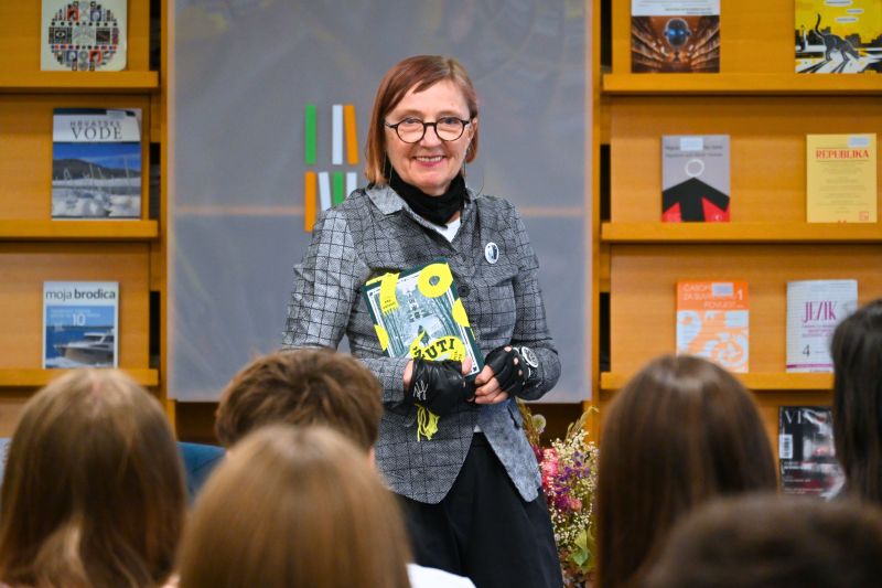 Tijekom interaktivnog susreta književnica je mladima govorila o svom stvaralaštvu i životnom putu, posebno istaknuvši svoj novi roman Žuti šal, koji tematizira goruće probleme suvremenog društva, a to su otuđenost, pretjerana uporaba tehnologije te je govorila o posljedicama koje takav način života ostavlja na pojedinca. Autorica je učenicima približila ideju romana kroz pitanje: Što se dogodi kada se naši uređaji isprazne, a mi se nađemo u nepoznatom prostoru, potpuno sami?