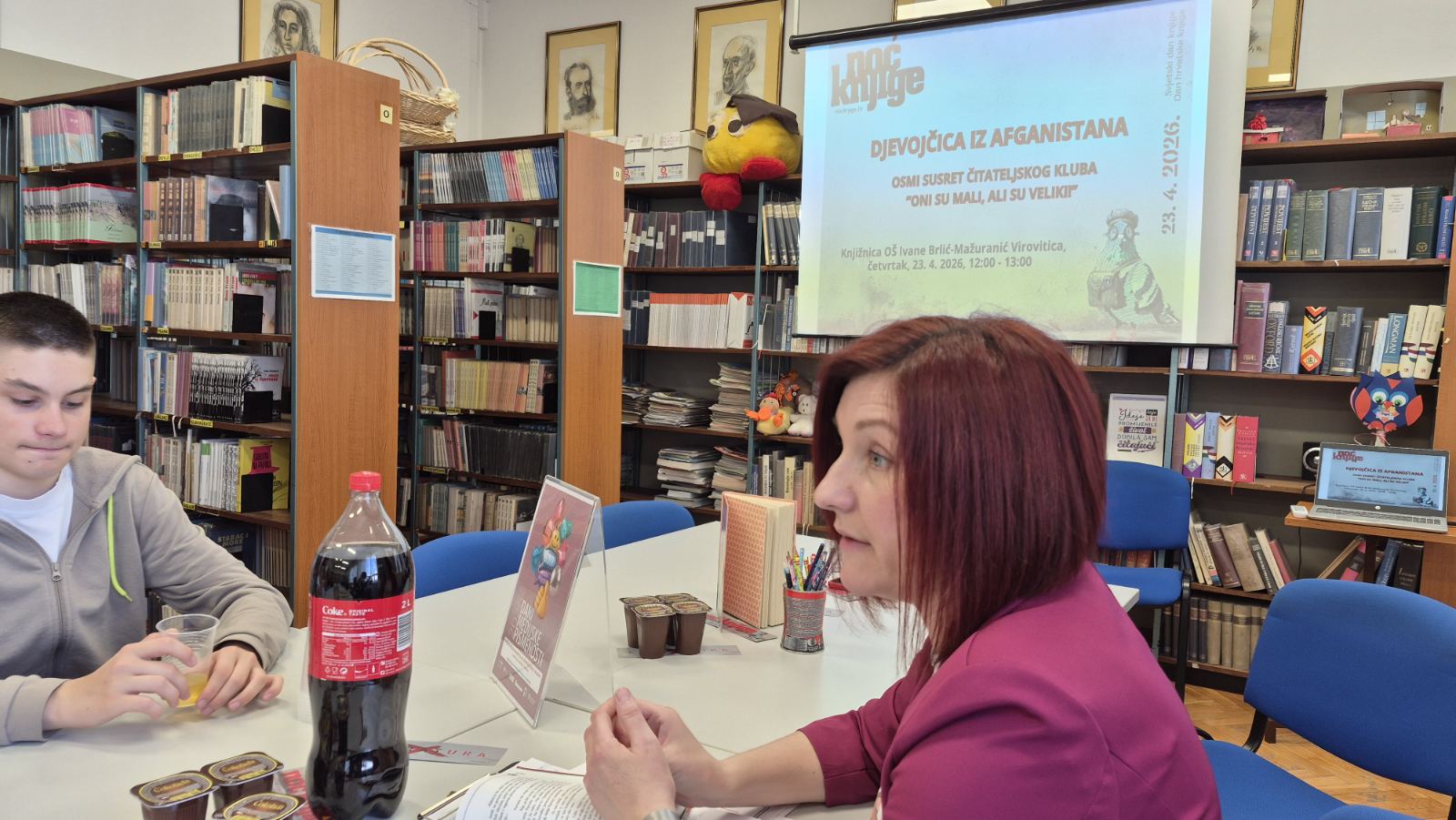 Osmi susret Čitateljskog kluba “Oni su mali, ali veliki” održao se u knjižnici Osnovne škole Ivane Brlić-Mažuranić Virovitica. Uz voditeljstvo knjižničarki Mirjane, Vesne i Marine na susretu su članovi razgovarali o knjizi Djevojčica iz Afganistana, kanadske autorice Deborah Ellis. Susret se održao u okviru manifestacije Noć knjige. Glavna junakinja živi u teškim uvjetima i u potpuno drugačijem svijetu od onoga u kojemu mi živimo. Ipak, kroz svoje misli, strahove i hrabrost pokazuje koliko su ljudska iskustva univerzalna. U njezinoj borbi za dostojanstvo možemo prepoznati sebe što nas podsjeća da smo svi povezani kao ljudi, neovisno gdje živimo. Upravo kroz njezinu priču razvijamo empatiju i osjećaj bliskosti s drugima, što se uklapa u ideju Noći knjige i poruku o važnosti književnosti u povezivanju ljudi.