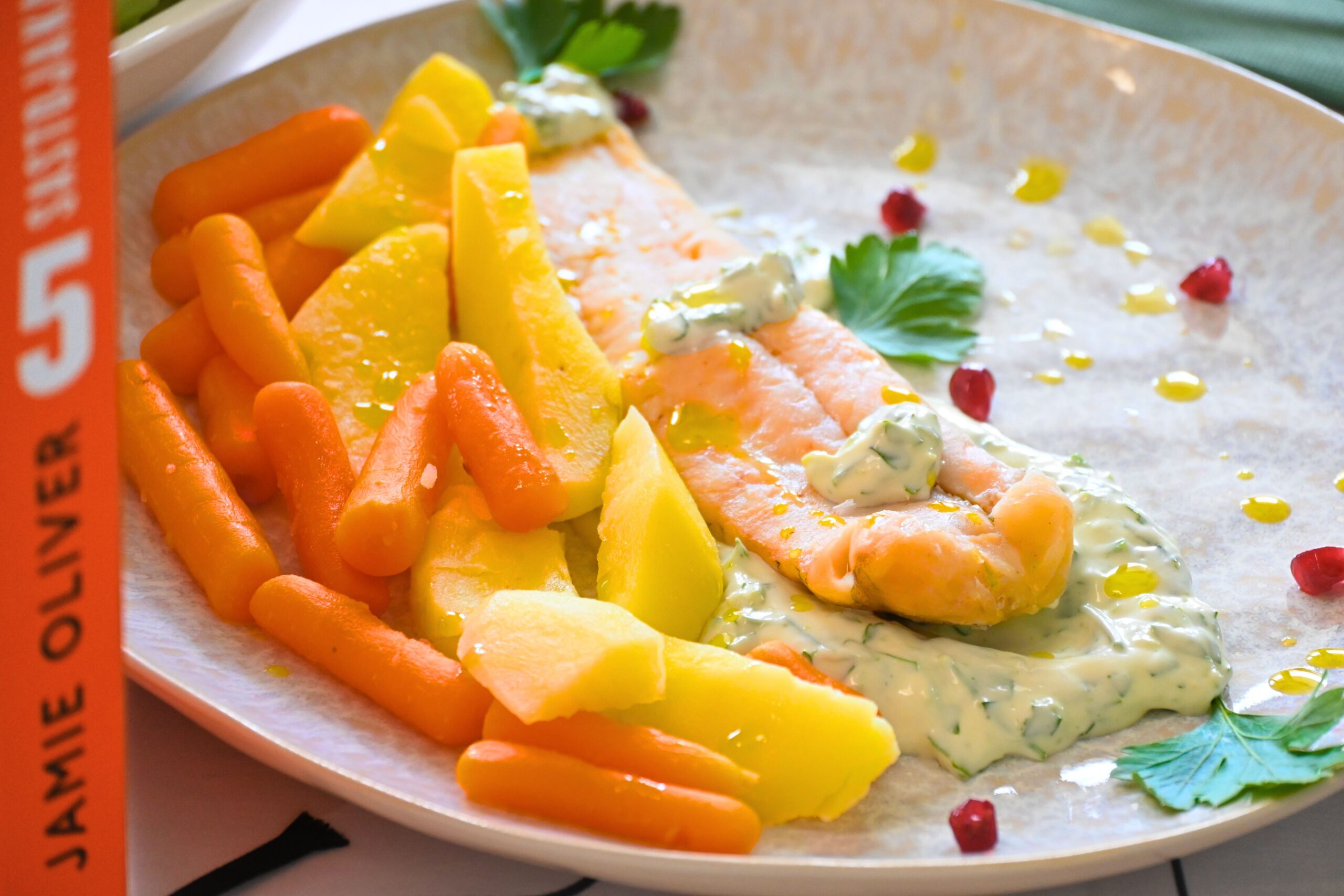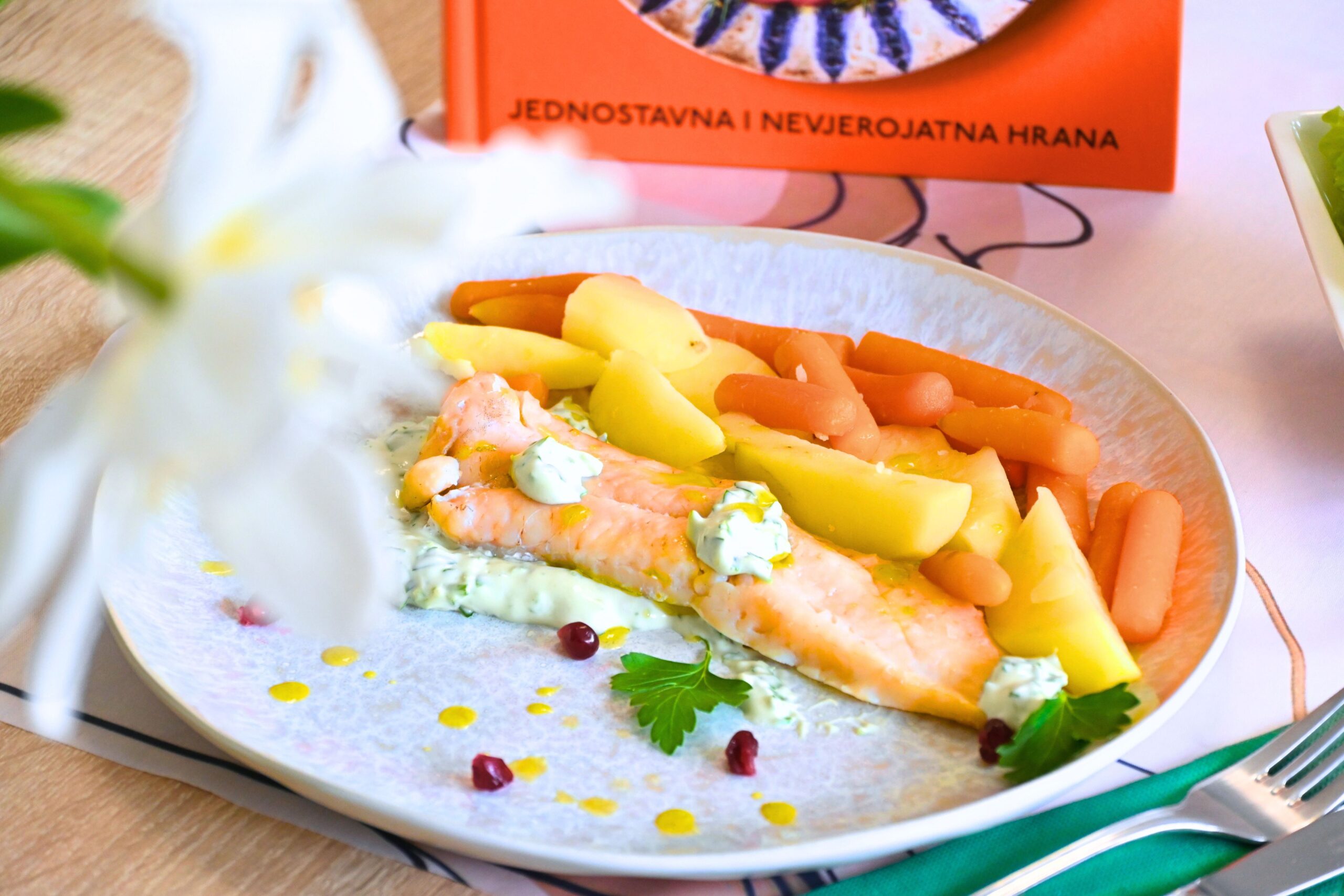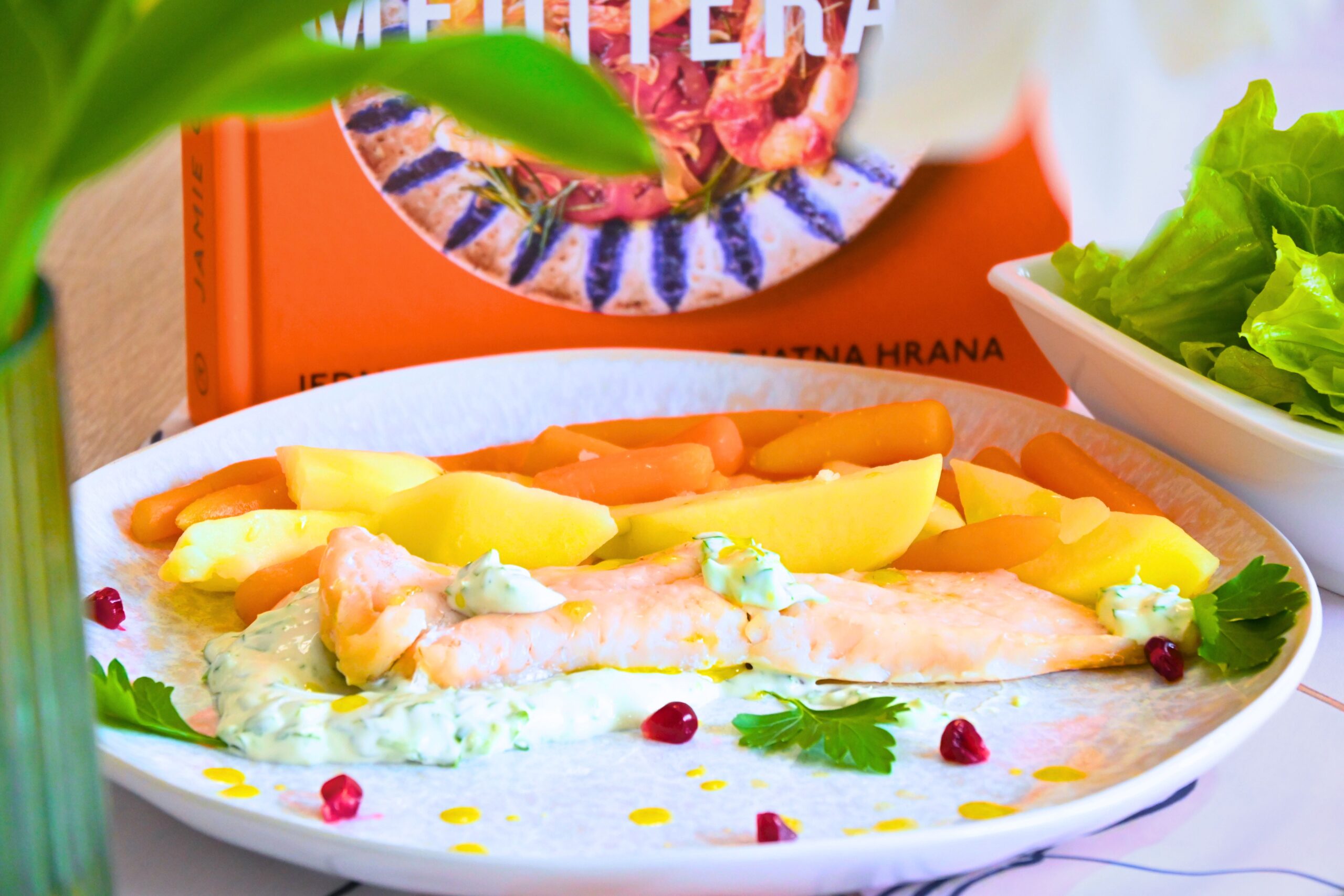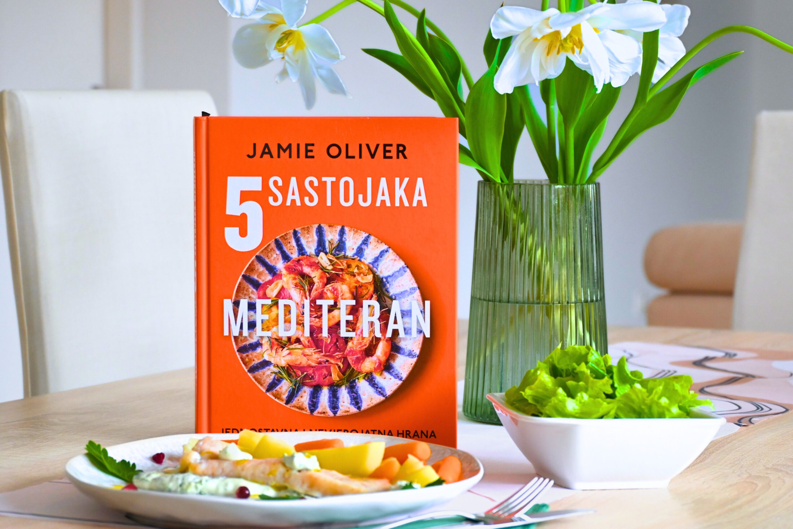 Ovoga mjeseca u rubrici „Jedi zdravo, čitaj zdravo” pripremili smo lagano proljetno jelo koje spaja jednostavnost i bogatstvo okusa. Radi se o ribi kuhanoj na pari uz mlade krumpire i baby mrkve, posluženu s aromatičnim aioli umakom. Recept dolazi iz nove kuharice u našem knjižničnom fondu, „5 sastojaka: Mediteran: jednostavna i nevjerojatna hrana”, poznatog chefa Jamiea Olivera, koji i ovoga puta dokazuje da je za izvrstan obrok potrebno svega nekoliko pažljivo odabranih namirnica. Posebnost pripreme ovoga jela krije se u načinu kuhanja. Dok se povrće lagano kuha u vodi, riba se priprema na pari iznad njega, upijajući blage, prirodne arome. Rezultat je sočna tekstura koja zadržava puninu okusa, ali bez težine. Uz ribu smo poslužili aioli umak od majoneze, češnjaka i peršina . U originalnom receptu koristi se bosiljak, no ovoga puta zamijenili smo ga svježim peršinom koji se pokazao kao izvrsna alternativa. Zavirite u našu novu kuharicu i otkrijte kako od samo pet sastojaka možete pripremiti prava mala kulinarska čuda! Kuharicu potražite u Knjižnici na Odjelu za odrasle. Dobar tek!