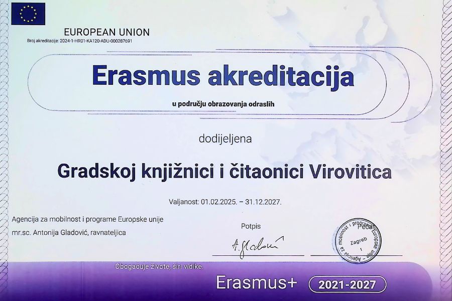 Gradskoj knjižnici i čitaonici Virovitica Agencija za mobilnost i programe EU dodijelila je Erasmus+ akreditaciju u području obrazovanja odraslih.